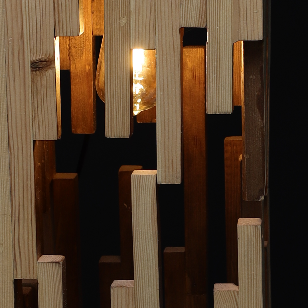 كما تم قطع الخشب بعناية إلى أنماط متدرجة؛ وهذا يمنح غطاء المصباح طابعًا ديناميكيًا يجعله أكثر من مجرد مصدر للإضاءة، بل قطعة فنية ملفتة للنظر.