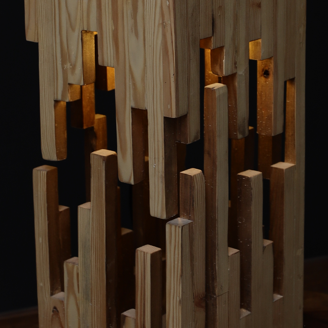 تتميز هذه الأباجورة بتصميم استثنائي يمزج بين الفن واللمسة الطبيعية، ويبدو مثل ناطحات السحاب الخشبية التي تحتضن الضوء.
