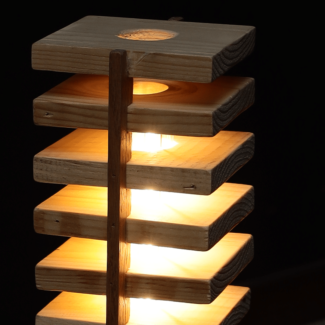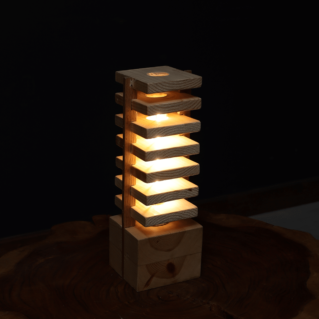 تعكس الأباجورة روح الإبداع في التصميم؛ فهو يتكون من طبقات خشبية متناغمة تسمح للضوء بالتسرب بلطف من خلال الفجوات بينها. يخلق هذا الترتيب أيضًا تأثير إضاءة ديناميكيًا يضيف طابعًا ساحرًا إلى المساحة المحيطة.