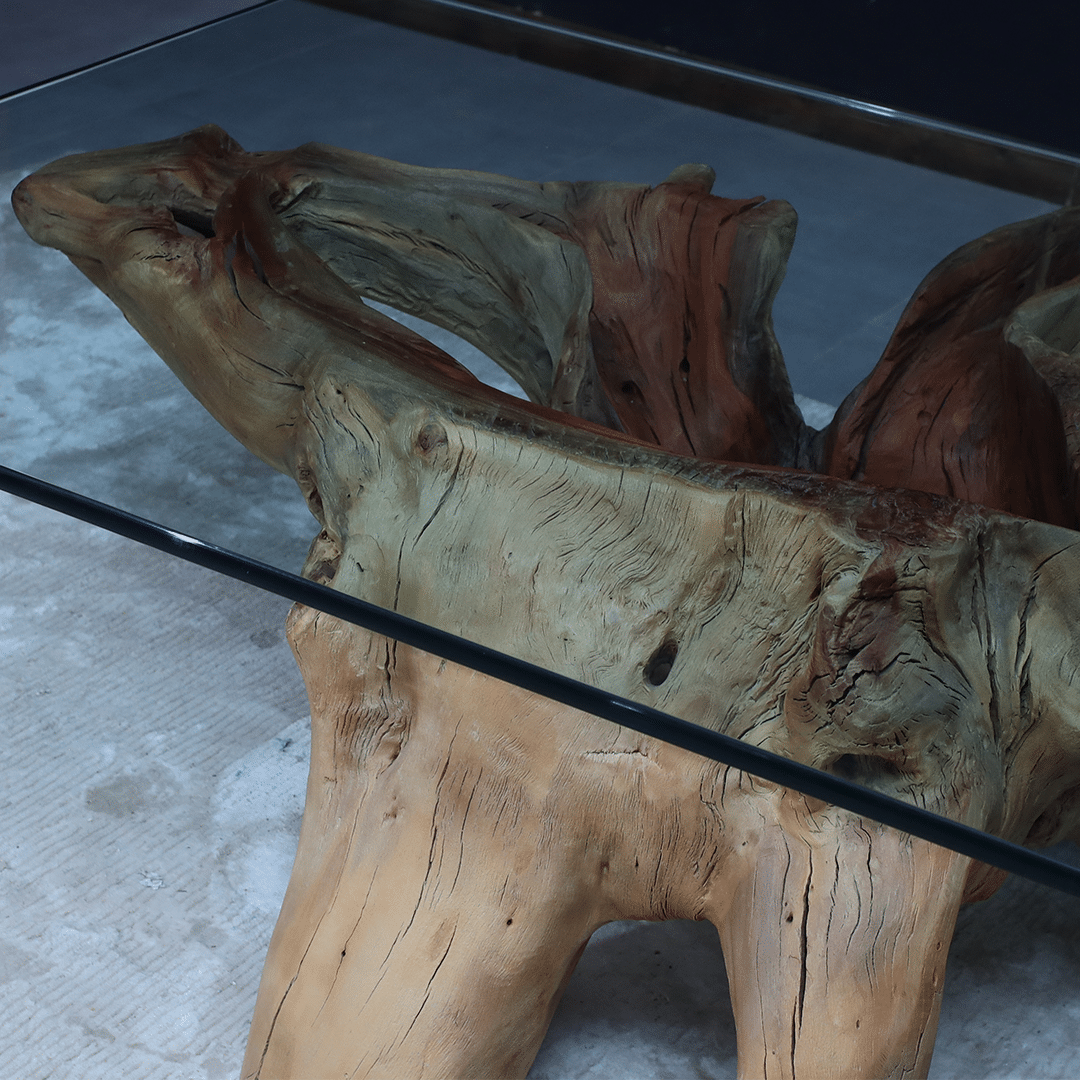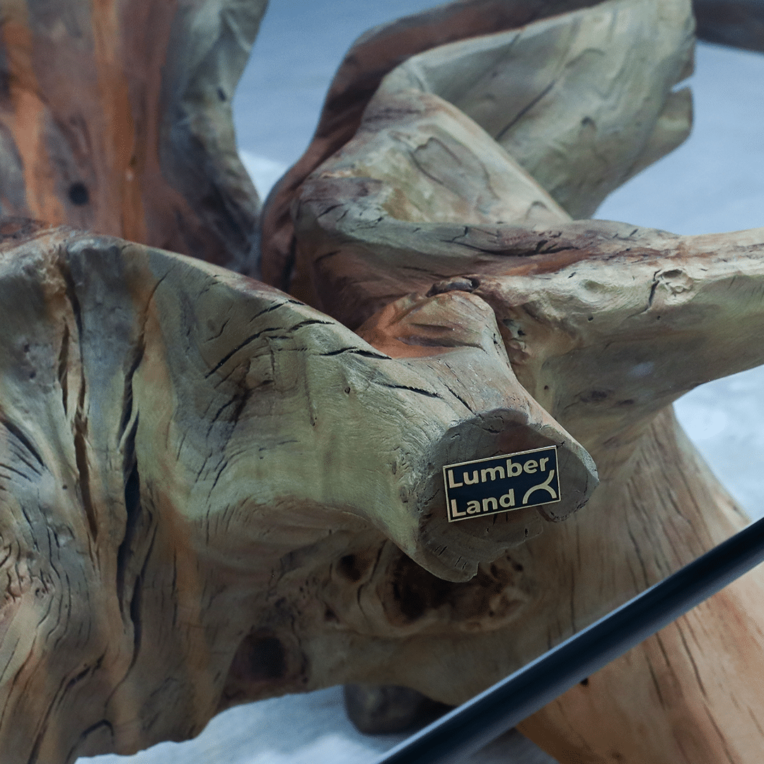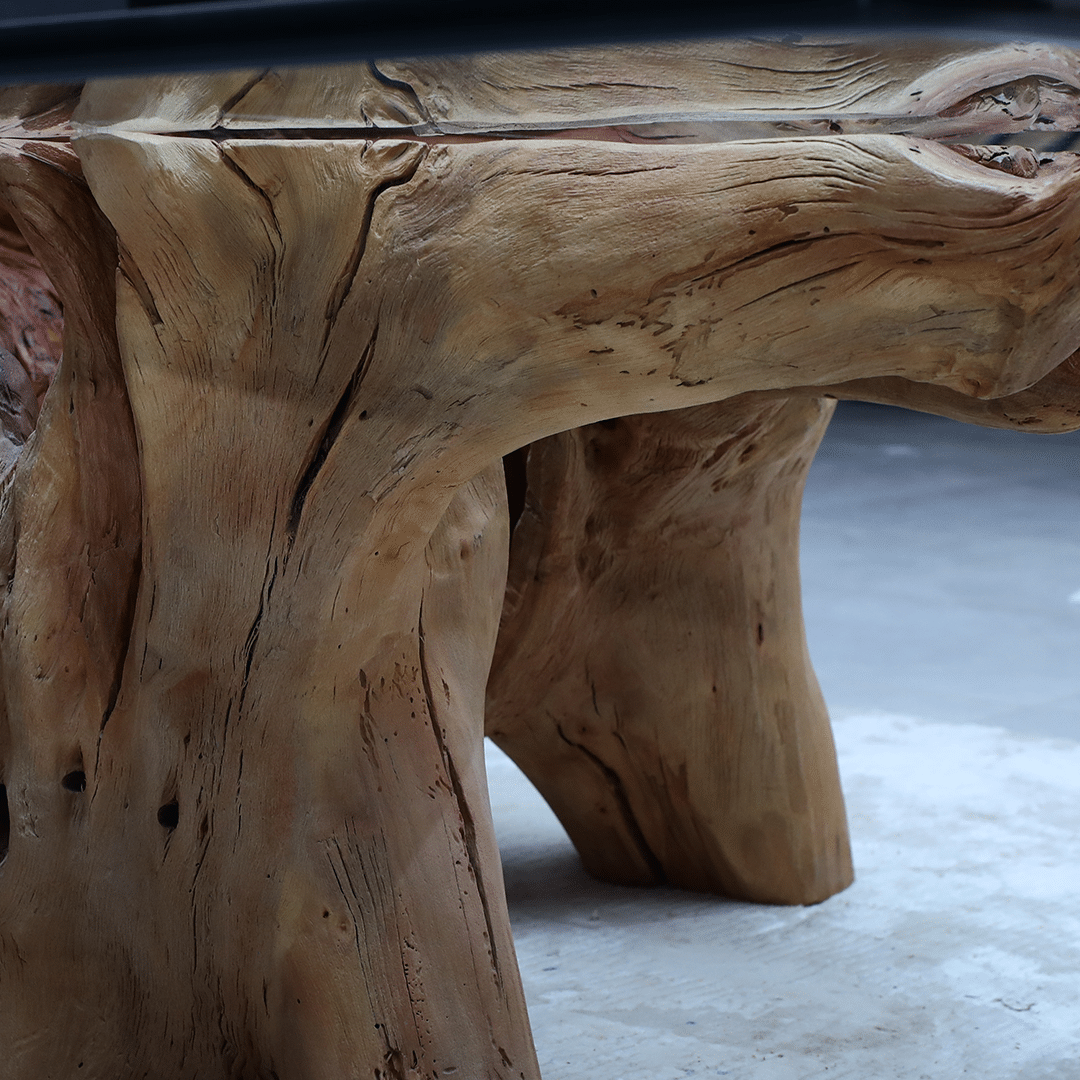 تتكون القاعدة من جذور خشبية طبيعية تم اختيارها بعناية شديدة؛ حيث تمثل هذه الجذور جوهر التصميم، فإنها تحتفظ بملمسها الخام وتفاصيلها الطبيعية، مثل العقد