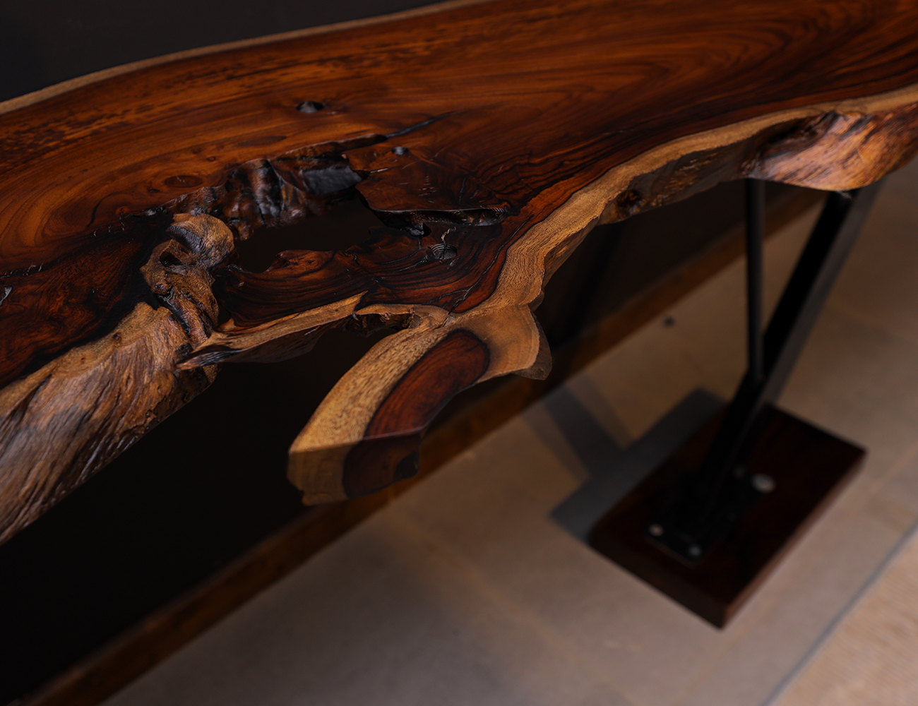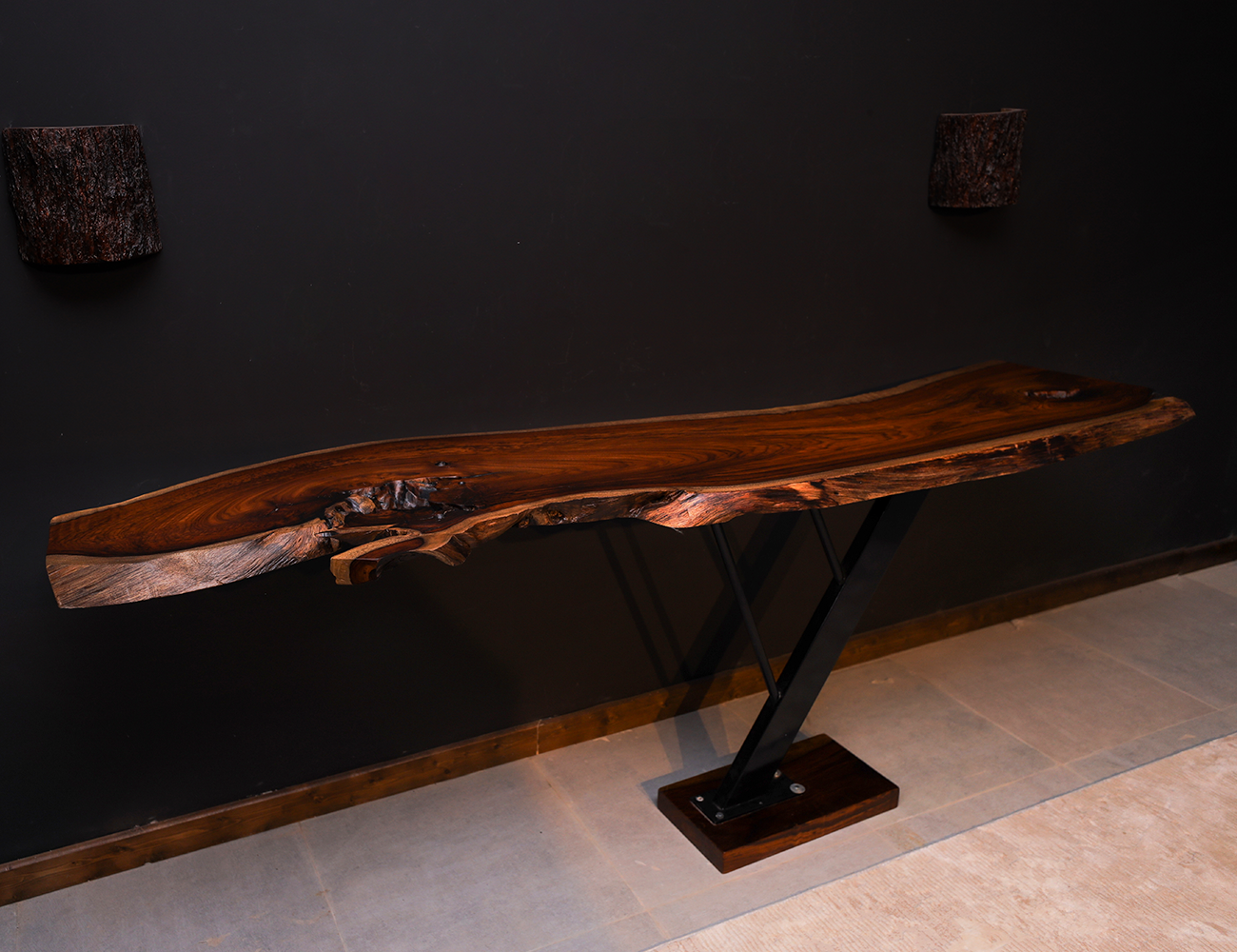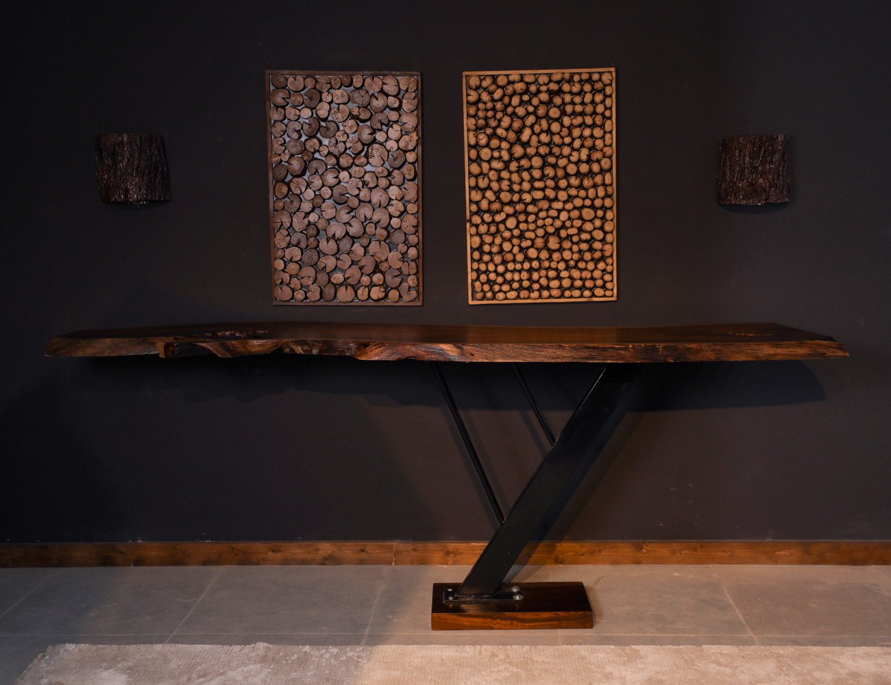 التفاصيل الفنية الجميلة: تتميز هذه الطاولة الجانبية بتصميم فريد ومميز، وتتميز بسطح واسع ومنحني برشاقة تكمله قاعدة تمزج الحديد الأسود مع الخشب الطبيعي.