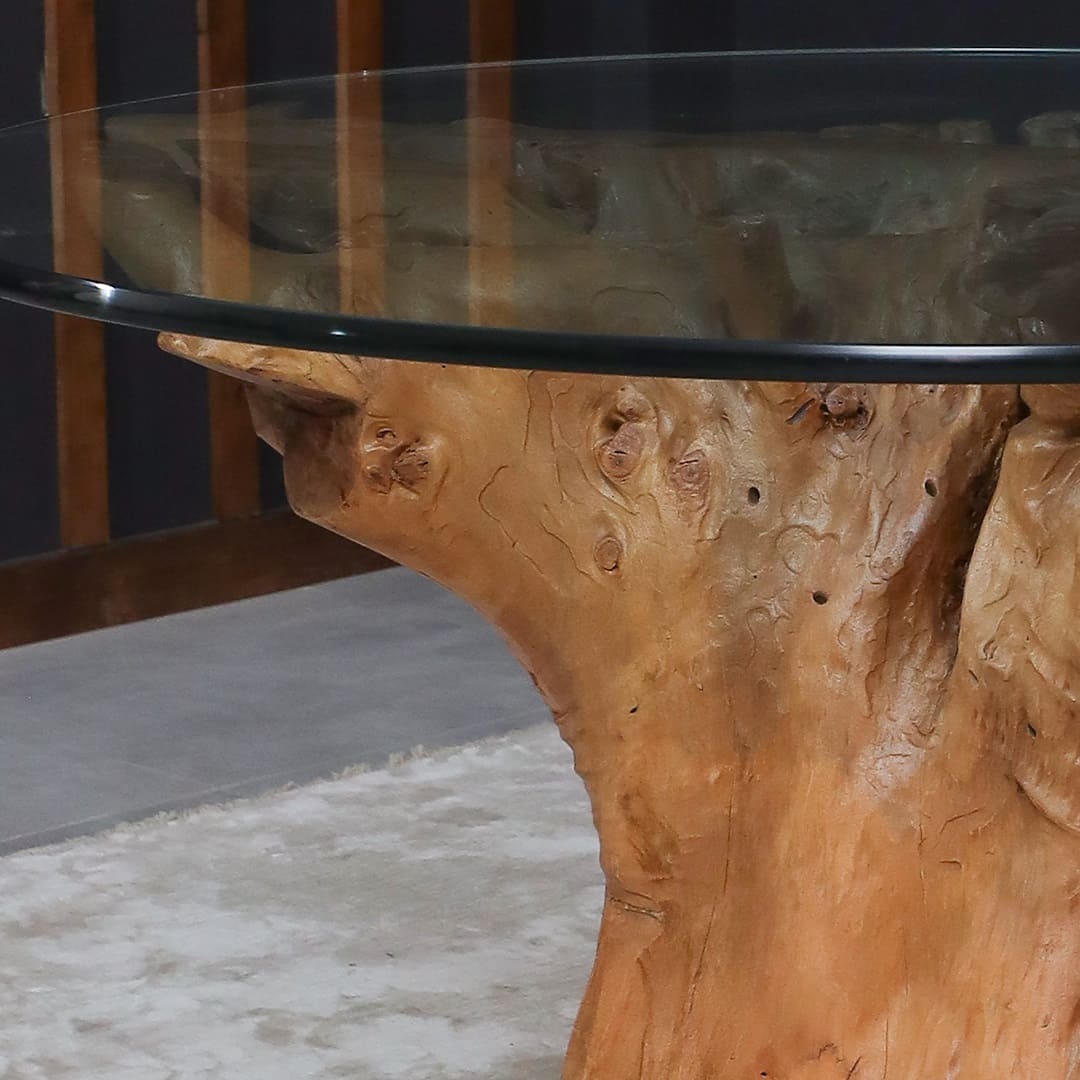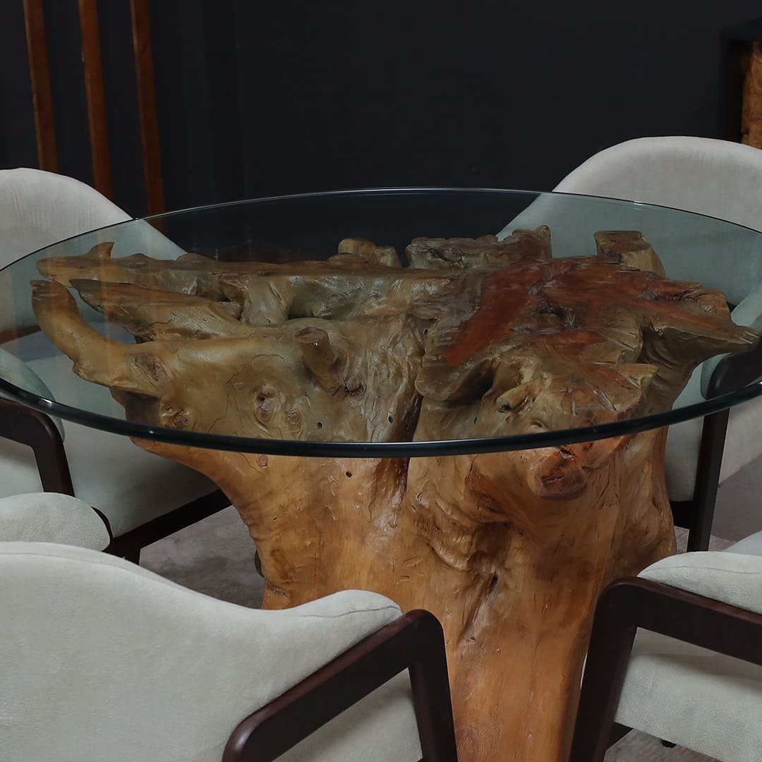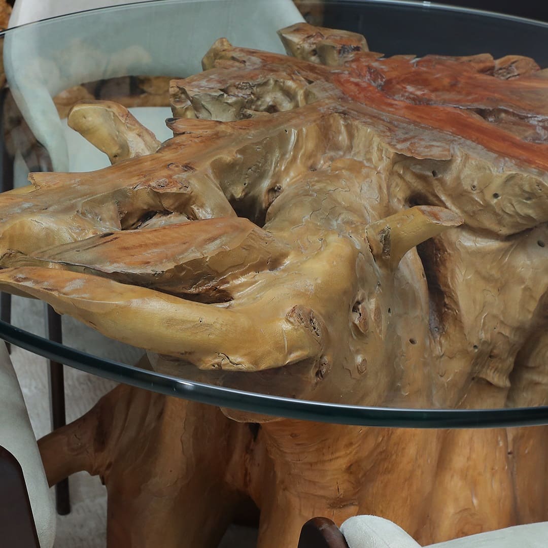 تتميز طاولة الطعام هذه بقاعدة من جذور الأشجارالطبيعية الذي يضفي عليها سحرًا وجمالًا، كما يعكس التصميم أيضًا أصالة الطبيعة وسحرها المذهل.