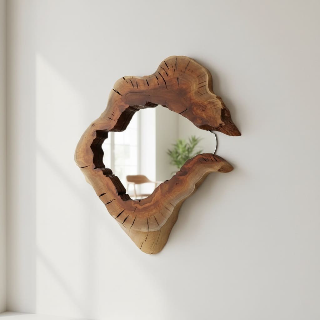 هذه المرآة هي قطعة فنية تجسد الجمال الخام للطبيعة، وقد تم تنفيذها باستخدام قطعة صلبة من الخشب ذات ميزات طبيعية غير منتظمة، وتم الحفاظ على حوافها الأصلية لتعكس طابع الخشب الحقيقي بروحه الدافئة.